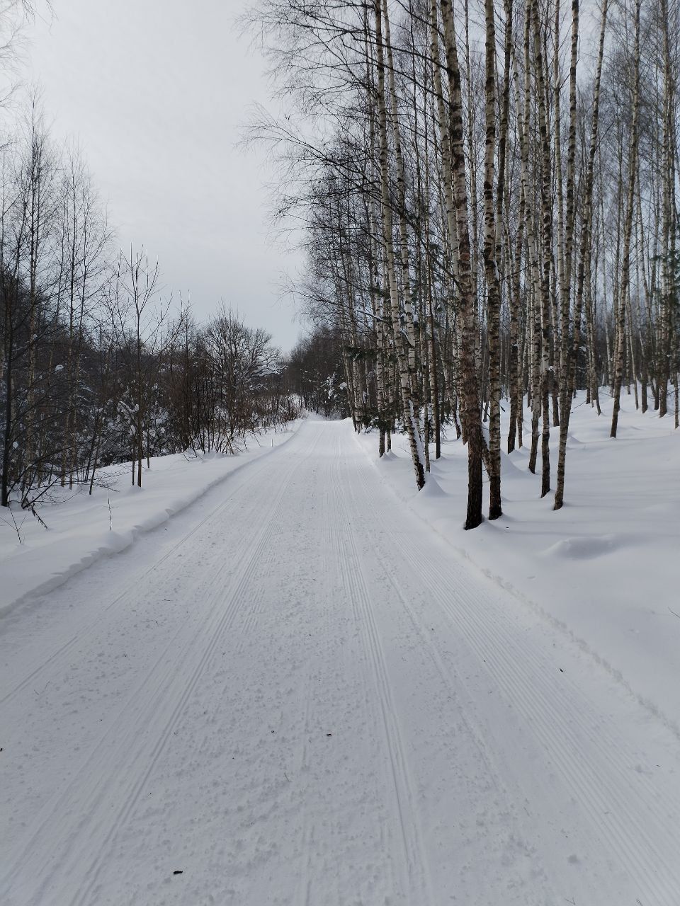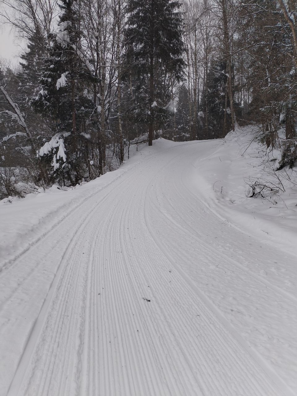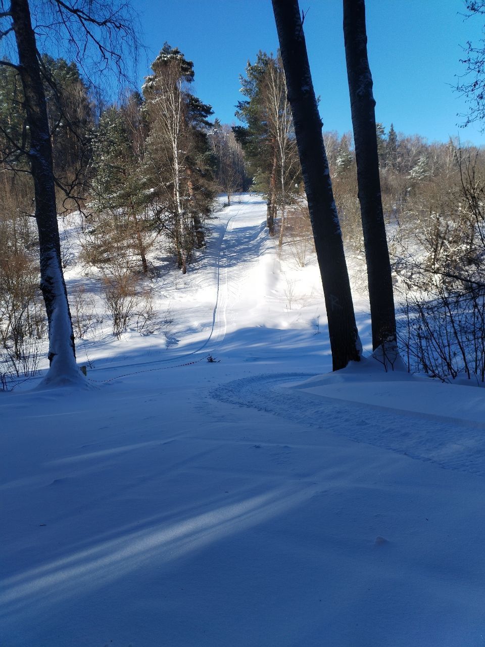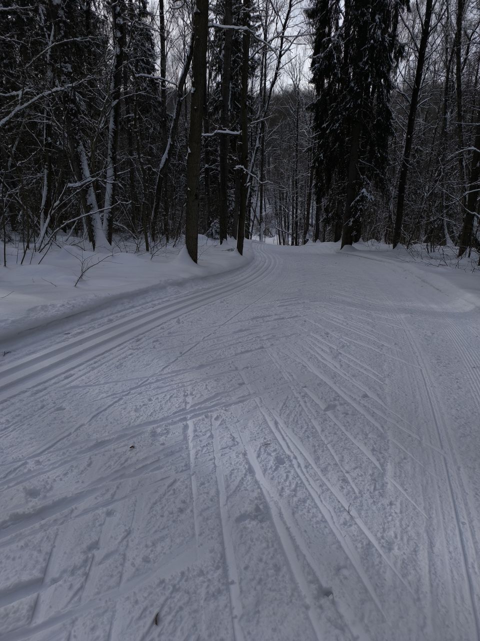 Отличная трасса. Никогда бы не поверил, что готовится энтузиастами. Кочек нет. Широко. На спусках снег плотный, не разбитый. Палки не проваливаются.
